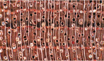 | Red brown | Clearly demarcated | Medium | Straight | Absent | Wood red brown to dark brown with lighter veins. Very pronounced internal stresses. Presence of resin veins Unpleasant odour when green. |